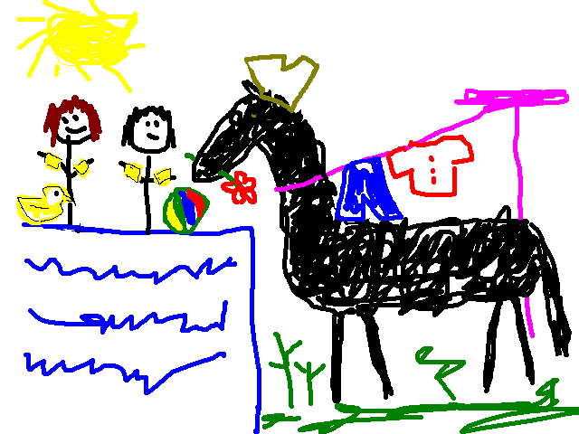 All heads turned towards the horse that was now standing next to the pool, stretching over the edge, reaching for his favorite little person and looking for a treat.