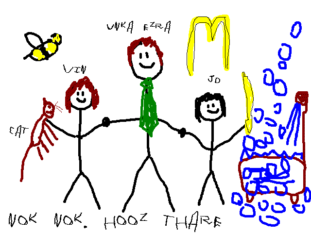 Ezra looked to Vin for help. With a put upon look, the younger boy turned to his adoptive brother and said, "Who's there?"