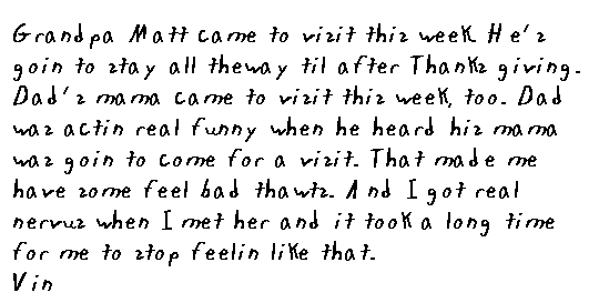 Glaring indignantly at the slender blond, little boy Dunne said, "I taked it all in there all ready. Maybe you leaved your stinky shoes in your pack-pack again."