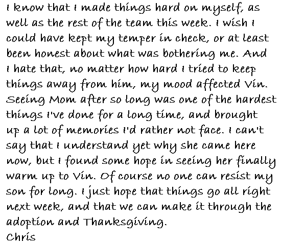 Chris had been relieved to hear his son's laughter when he entered the house. He had been worried all morning about how the seven-year-old would fare alone in the house with his mother. Then, as he approached the great room, he was shocked to see Vin sitting near his mother, the two of them talking and laughing. His jaw dropped and he stopped dead in his tracks. It was only when he felt a hand on his shoulder that he moved. Turning, he looked at his father, then back to his mother. He saw a variety of emotions crossing Claire's face and knew those same emotions were mirrored on his own.