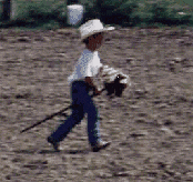 The whistle blew, the bucking chute gates were opened and two dozen goats were released into the arena, kicking up clouds of dust from the loose packed soil. Laughing with delight, JD raced after a goat with a couple of dozen 'Mini's'. JD jumped at a nearby goat, sprawling in the dirt when the goat darted away. He jumped up and grabbed for another one. The arena was complete chaos. The crowds were vigorously cheering the four to six year olds in their efforts.