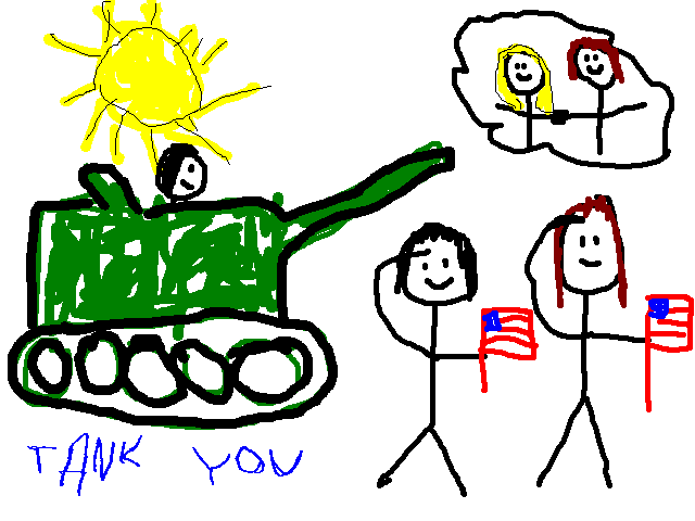 ??? But ??? See, there's the tank we saw at the parade and I wrote tank you. Get it?