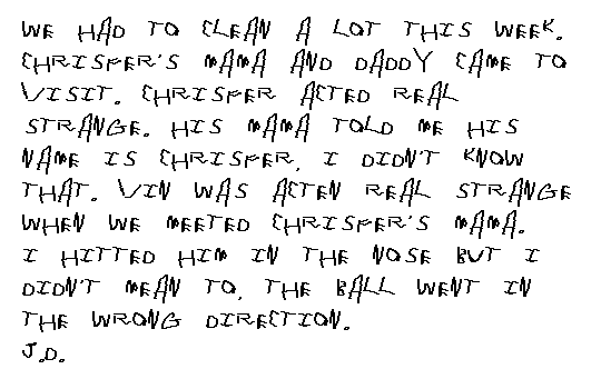 Chris had been acting strange all day; pacing around the house and grumbling that they didn't have a lot of time to make everything look its best. He and JD had gotten a little nervous, but Buck had taken them out onto the porch and explained. Chris really wanted the house to look especially nice, because his parents were coming for a visit. They had gotten excited about the news; both of them liked the idea of Grandpa Matt coming to see them. But it didn't explain why his Dad was so nervous.