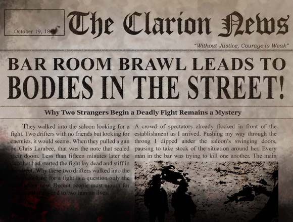 "And don't even think about going to bed!" Hedgecock snapped. "I am looking around - are you? This is front page news, this is what we do. Are you going to slack off and let the competition get the edge?" He delivered the question with a pointed look at Mary, standing just a few feet away, still recovering from the heat and smoke. Claire's weary gaze went from Post editor to Clarion editor. Pursing her lips tightly, she spun and pushed tiredly through a trio of ash-covered citizens to where Buck and Josiah assisted Nathan with the wounded. Reaching up behind damp hanks of hair to her ear for a pencil that wasn't there, the reporter began to question the lawmen.
