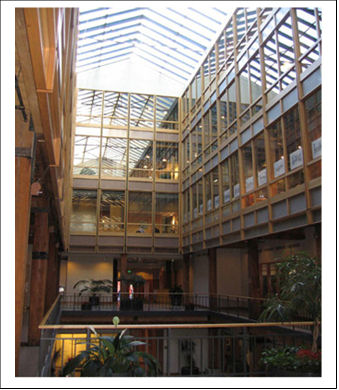 Tangent had an open floor plan, with a central space that was airy and light. On the bottom floor there was an atrium that framed the front desk area. The glass ceiling over the open space kept the plants in the atrium growing, and created a sense of spaciousness. When it snowed, it gave visitors the feeling they were staying in a large igloo.