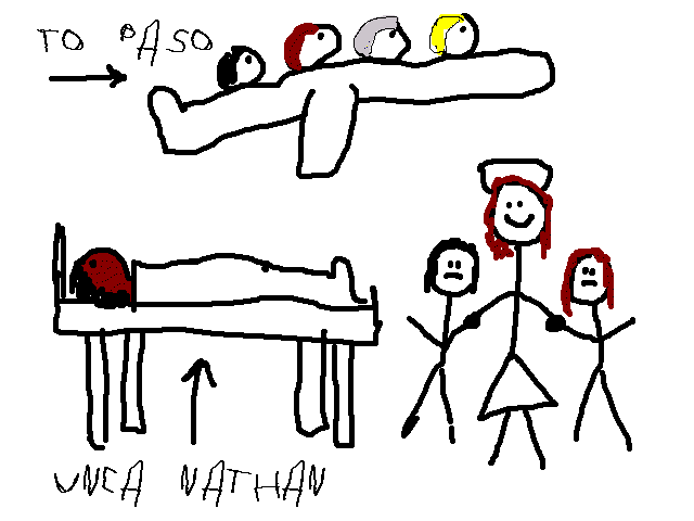 JD you're supposed to start at the beginning. Dad and Buck, and Uncle Ezra and Uncle Josiah had to go to El Paso so Uncle Nathan said he would stay with us.
