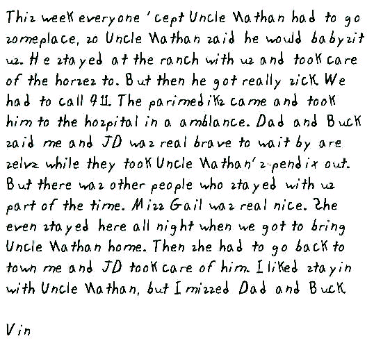 "Vin, is Unca Nathan gonna be okay?" JD asked nervously. "I wish Da was home."