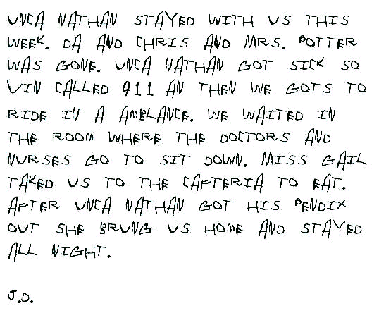 "Yeah, Miss Gail said every time Unca Nathan moves to another room, he is gettin' closer to goin' home," JD said. "What's a 'covery room like?"